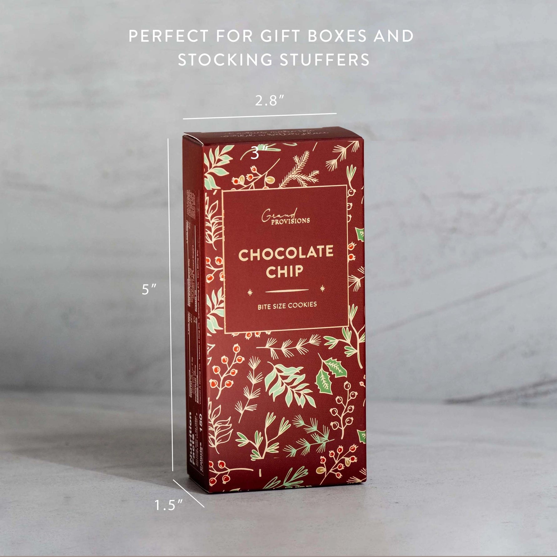 Indulge in the perfect holiday treat with our bite-size crunchy chocolate chip cookies, beautifully packaged in festive Christmas-themed boxes.