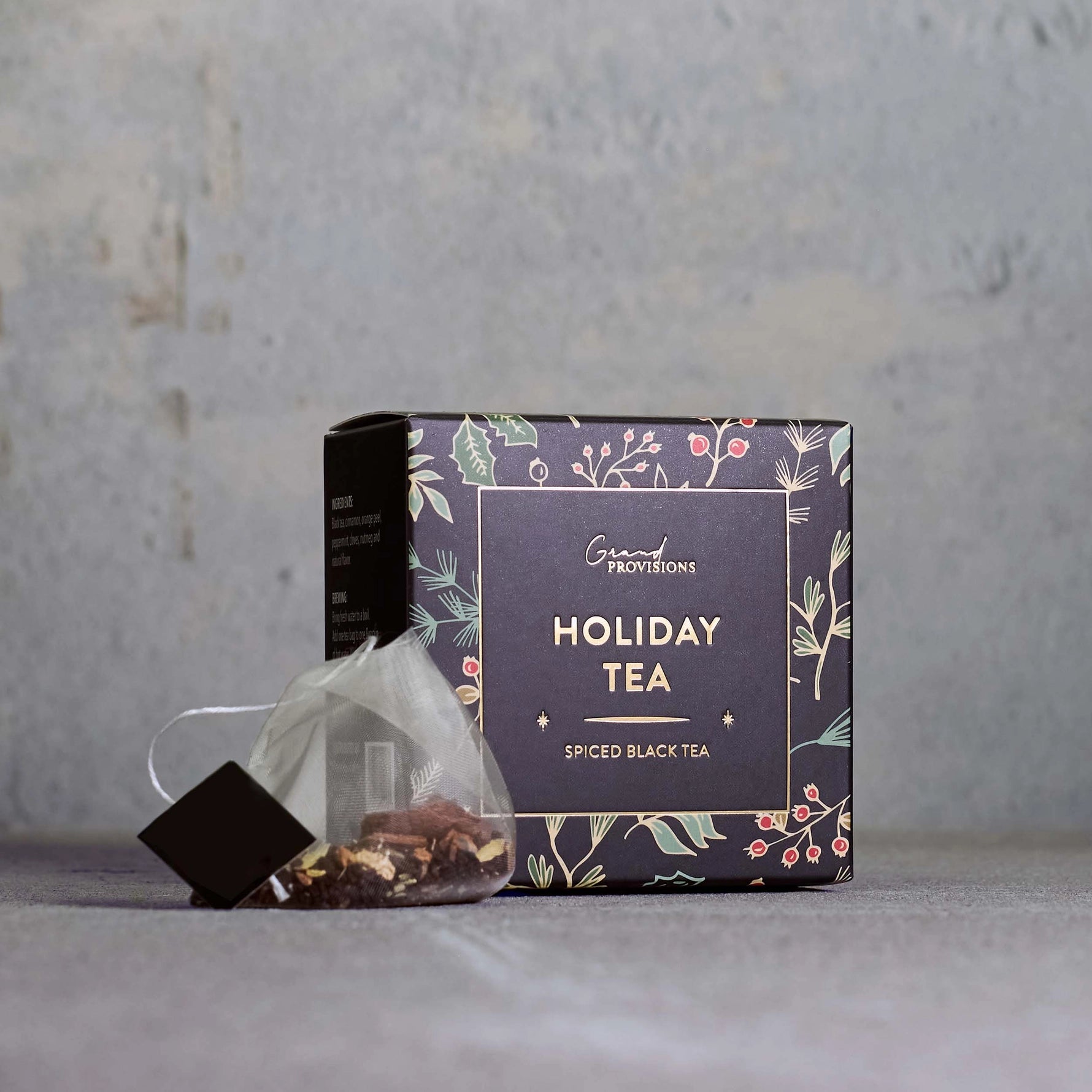 Each beautifully packaged holiday box contains 5 pyramid sachets, offering a delightful mix of black tea, cinnamon, orange peel, peppermint, cloves, and nutmeg.